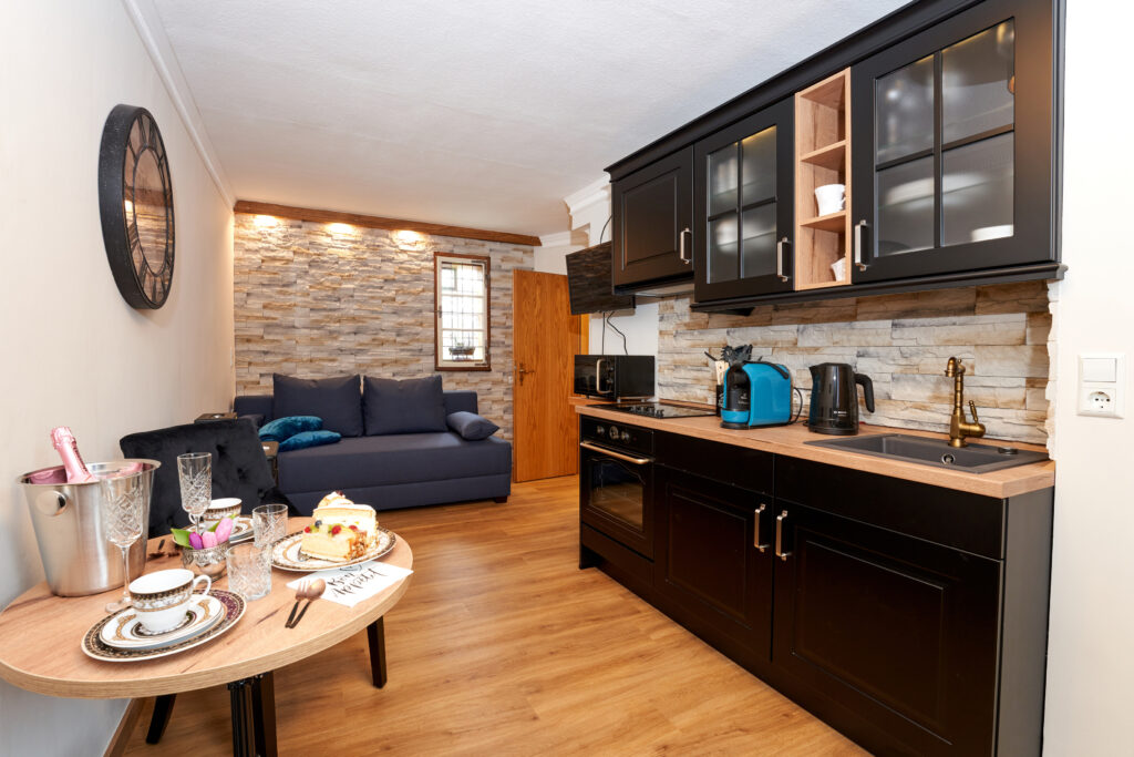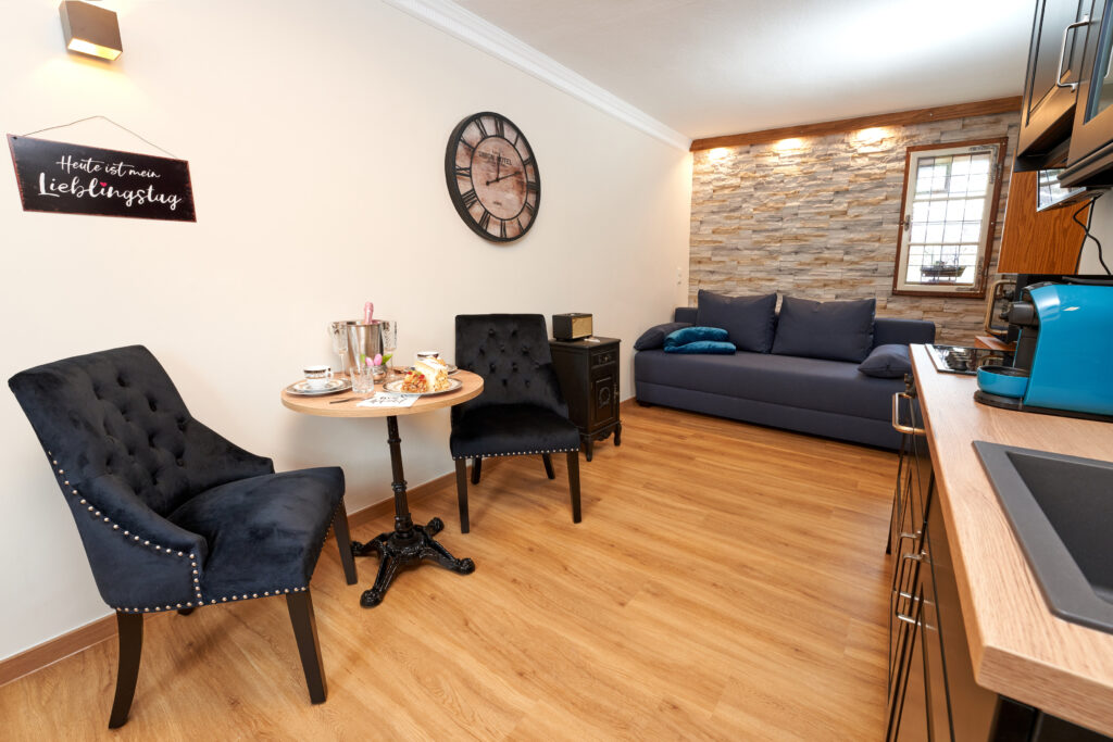 Die Stollenstube ist ein gemütliches Studio für zwei Personen mit warmem Naturstein-Look und moderner, klarer Gestaltung. Ein Ort zum Ankommen, Durchatmen und Abschalten.